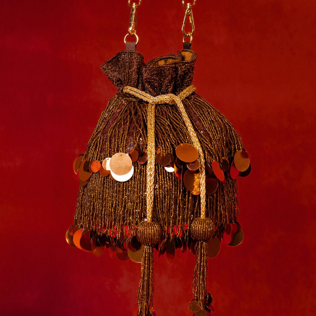 Crafted from premium fabric, the bag has a soft drawstring closure adorned with intricate beaded tassels, enhancing its traditional charm. The golden braided straps add a regal touch, making it perfect for weddings, festive occasions, or evening soirées.