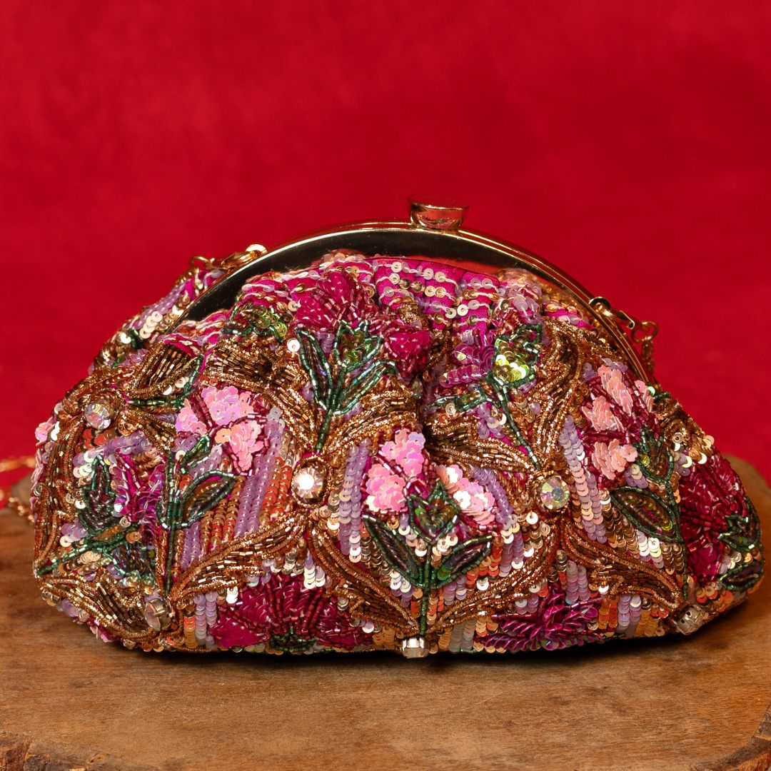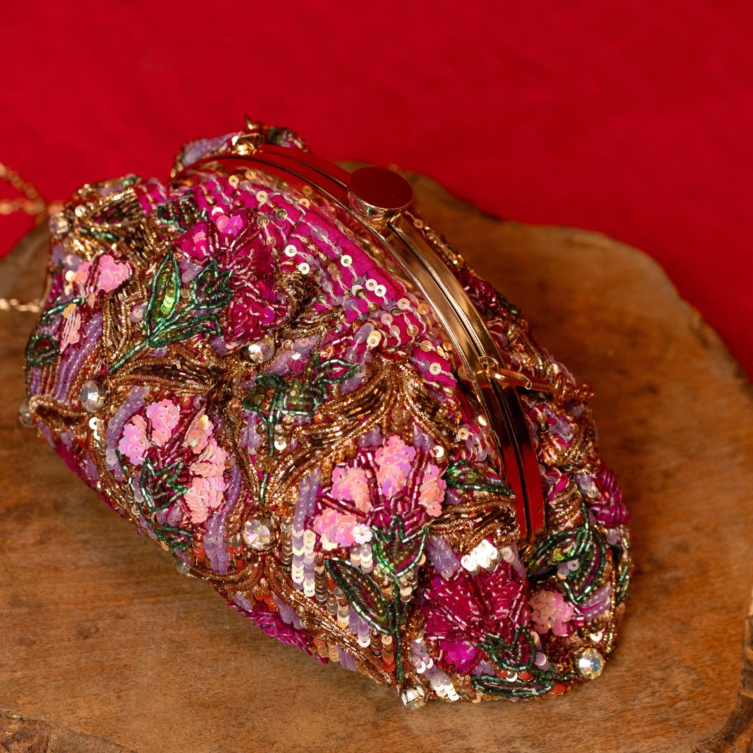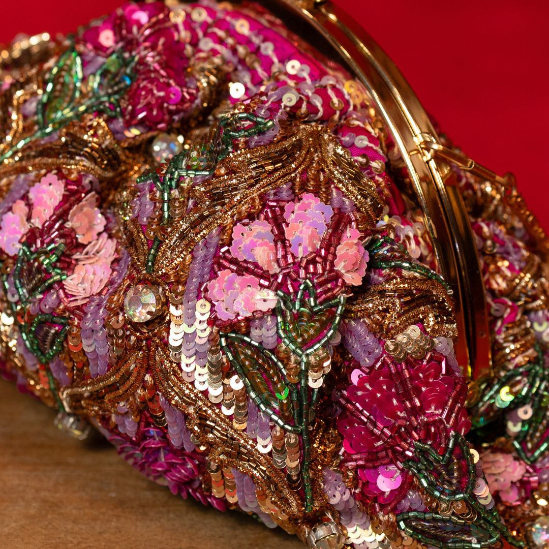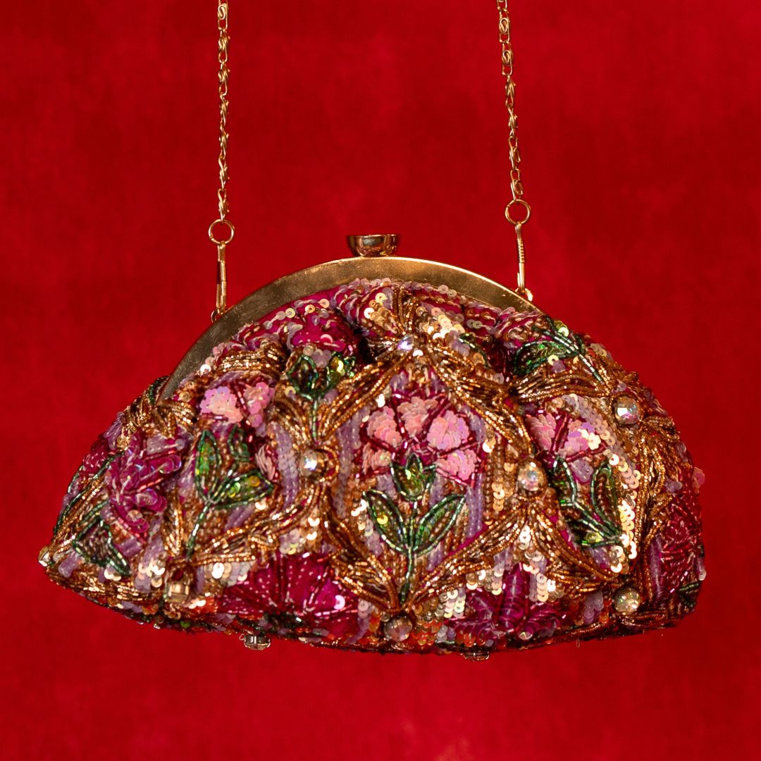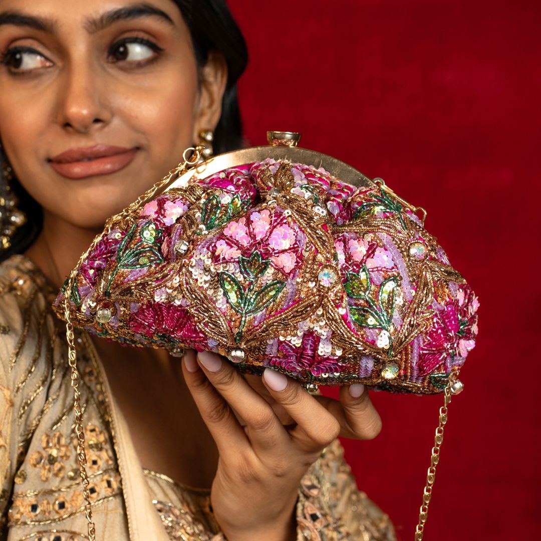 The Diana Clutch showcases beautifully hand-embroidered roses that perfectly complement its soft pink base fabric. This meticulous detailing enhances the clutch’s elegant appeal, making it a sophisticated accessory for any refined ensemble.