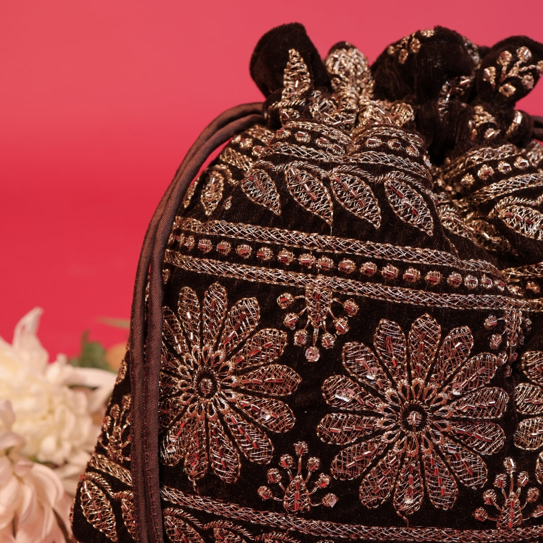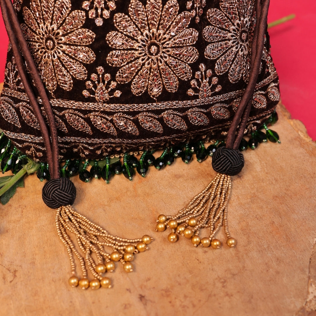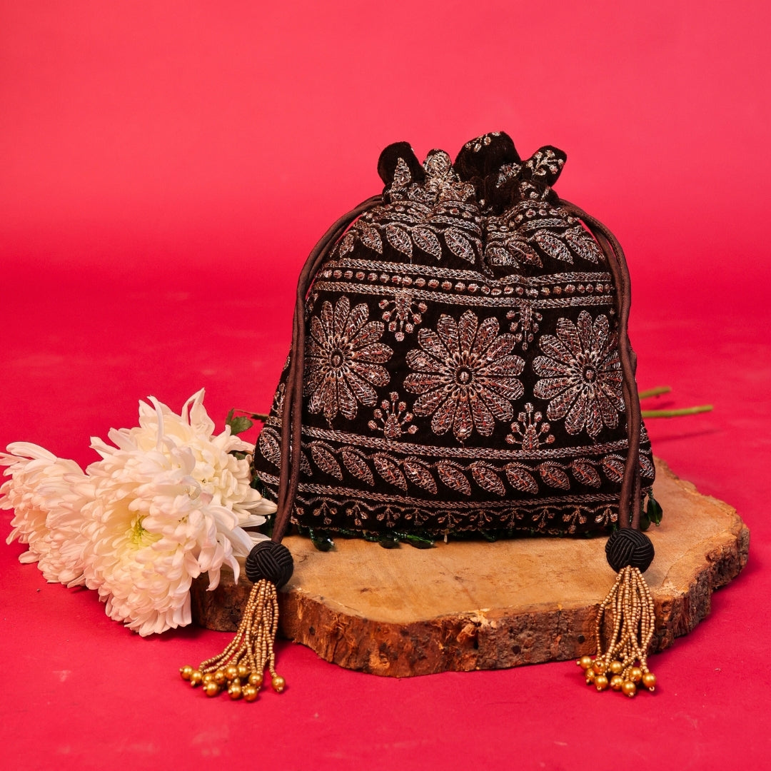 Sophisticated and timeless, the Evara Glint Potli is handcrafted in plush black velvet and adorned with intricate silver floral embroidery inspired by traditional Indian motifs. Delicate threadwork, subtle bead accents, and finely finished drawstrings lend the piece a graceful richness, while the embellished tassels and crystal fringe add understated movement and shimmer. Thoughtfully handcrafted by skilled Indian artisans, this potli is designed for evening celebrations, weddings, and festive occasions—an heirloom expression of GLAMGLINT’s artisanal luxury.