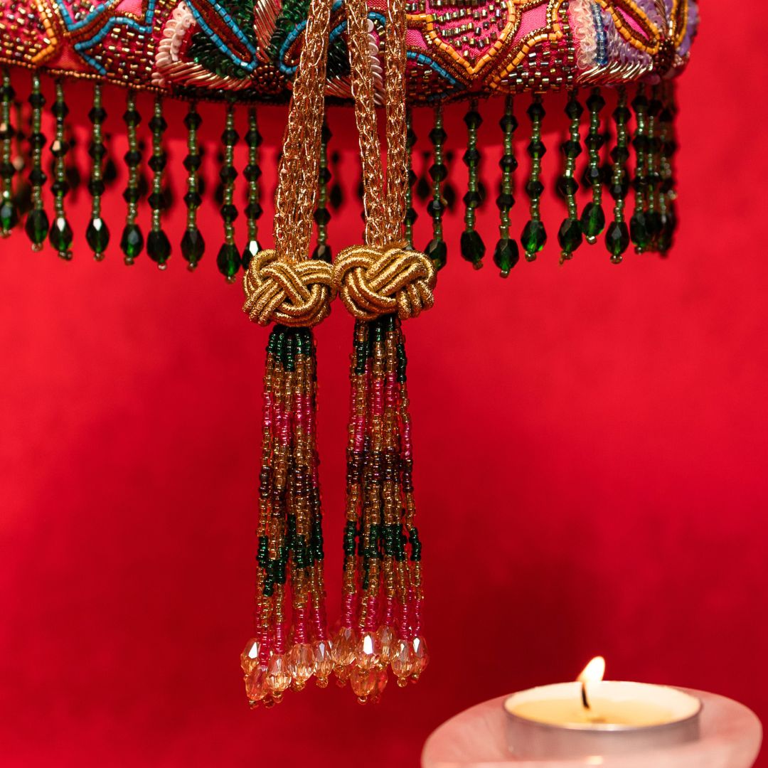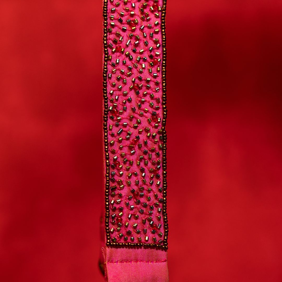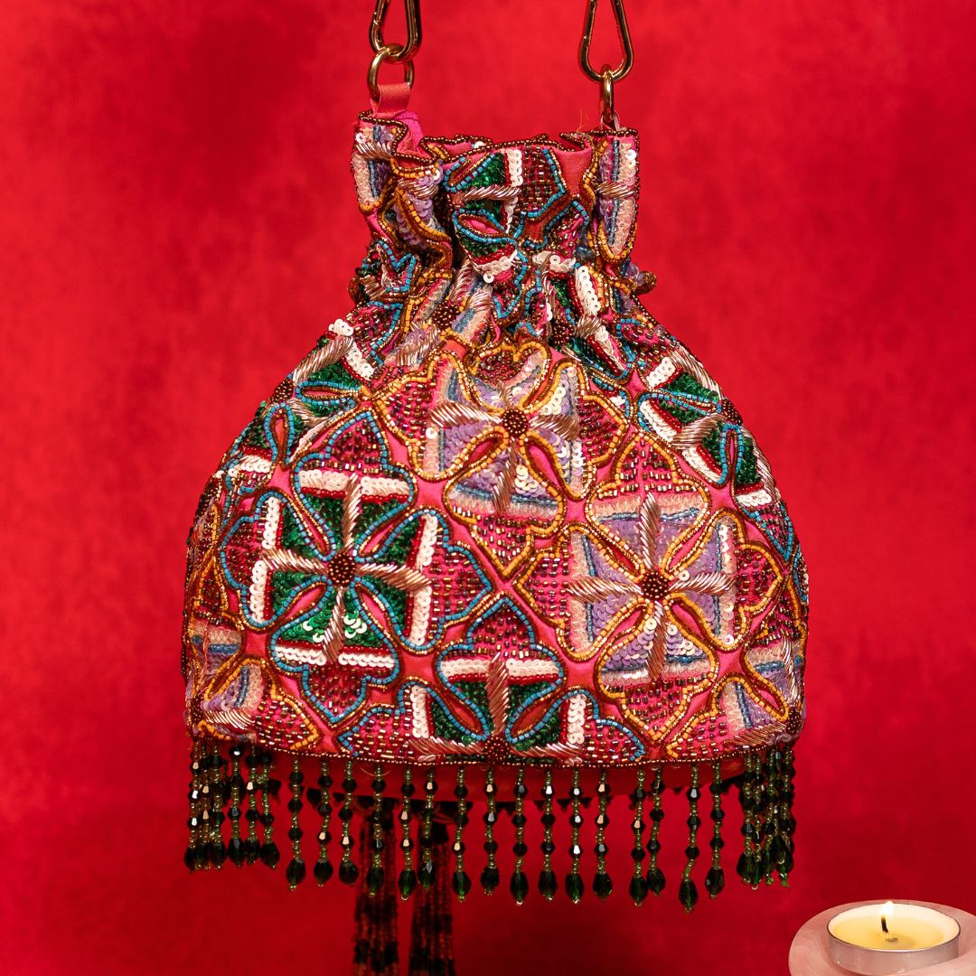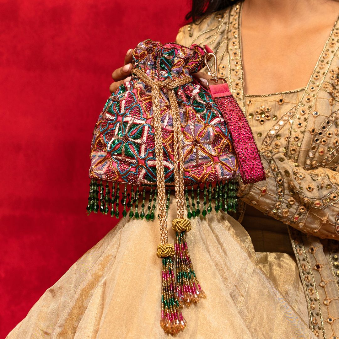 Elevate your style with the Hayat Potli, a beautifully crafted accessory featuring a vibrant pink base adorned with intricate multicoloured hand embroidery. This potli bag combines traditional artistry with versatile design, perfect for adding a refined touch to festive or formal attire. Its compact size ensures convenience while making a striking statement.