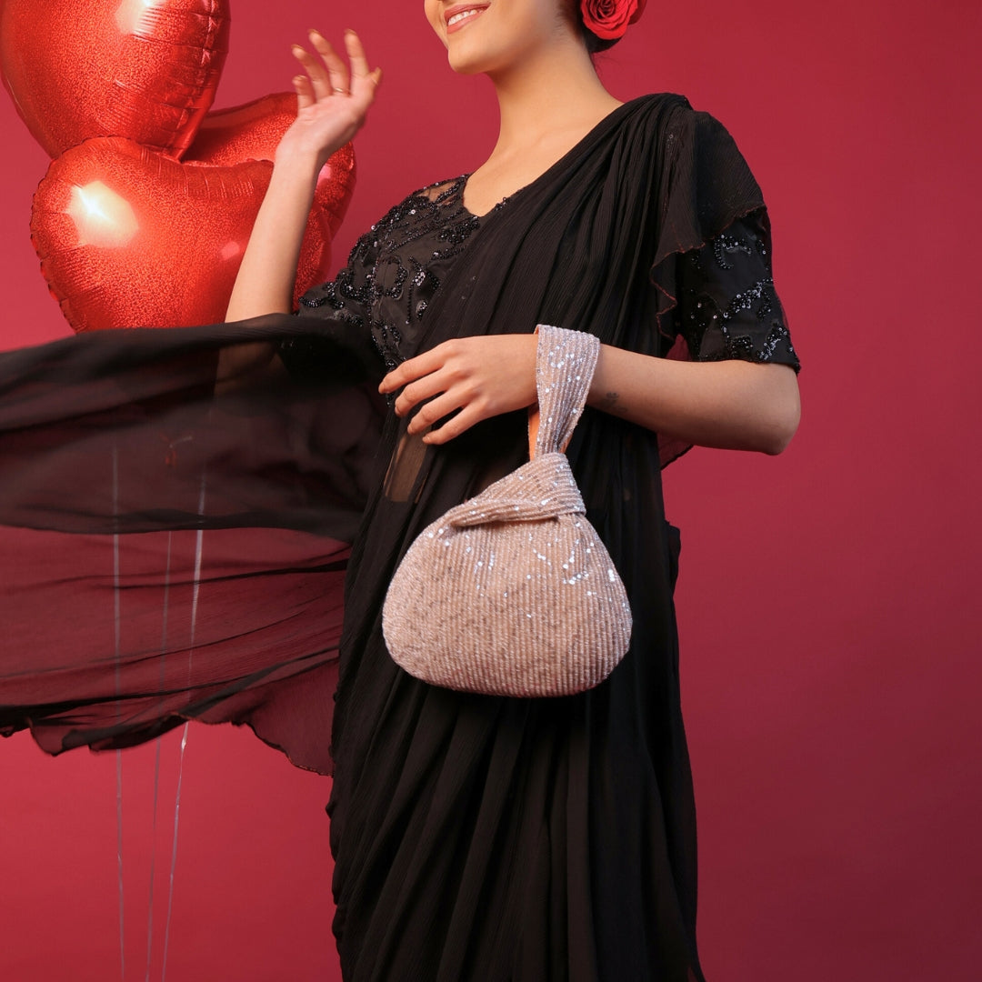 The Ira Champagne Knot Bag is a refined expression of understated luxury. Crafted in a luminous champagne hue, this handcrafted bag features a delicately textured fabric accented with subtle sequin detailing that shimmers softly with movement. Designed with a distinctive knotted handle and a gathered silhouette, it adds effortless elegance to evening and festive looks. Perfect for cocktail parties, wedding receptions, and celebratory occasions, this timeless piece is proudly made in India.