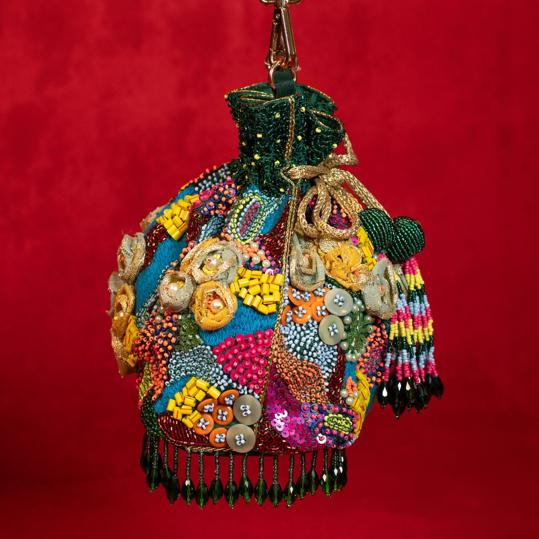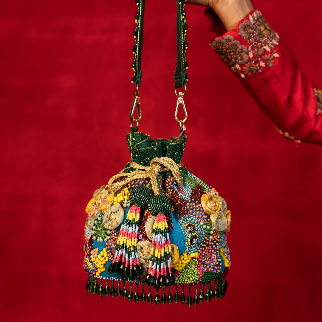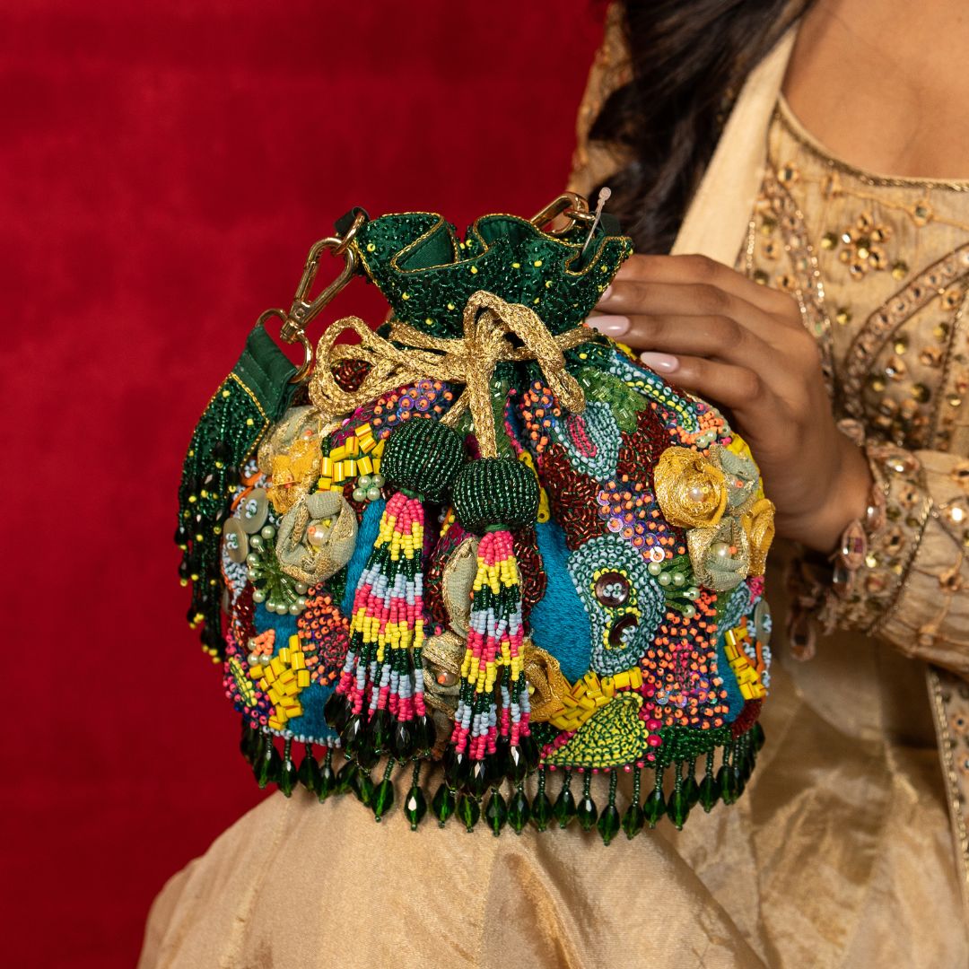 The Mehak Potli is a hand-embroidered green pouch featuring exquisite multicoloured threadwork that exemplifies skilled craftsmanship. Its vibrant embroidery enriches the classic green base, creating a striking yet elegant accessory ideal for festive occasions. Compact and stylish, this potli offers both charm and functionality for carrying your essentials with refined ease.