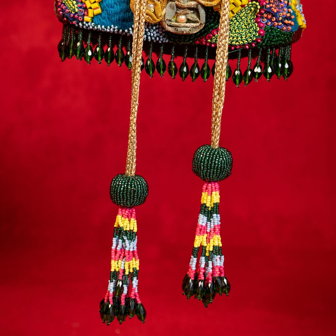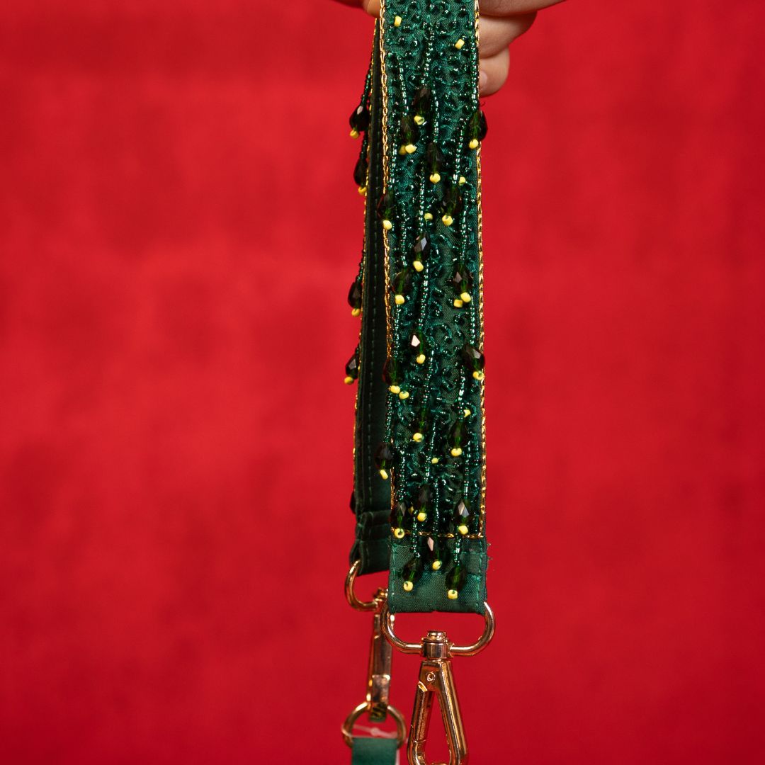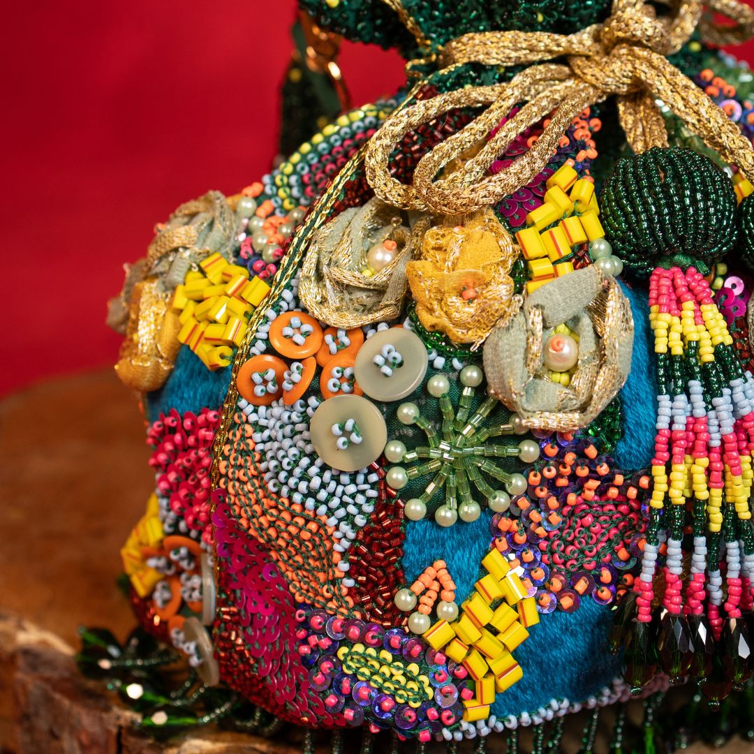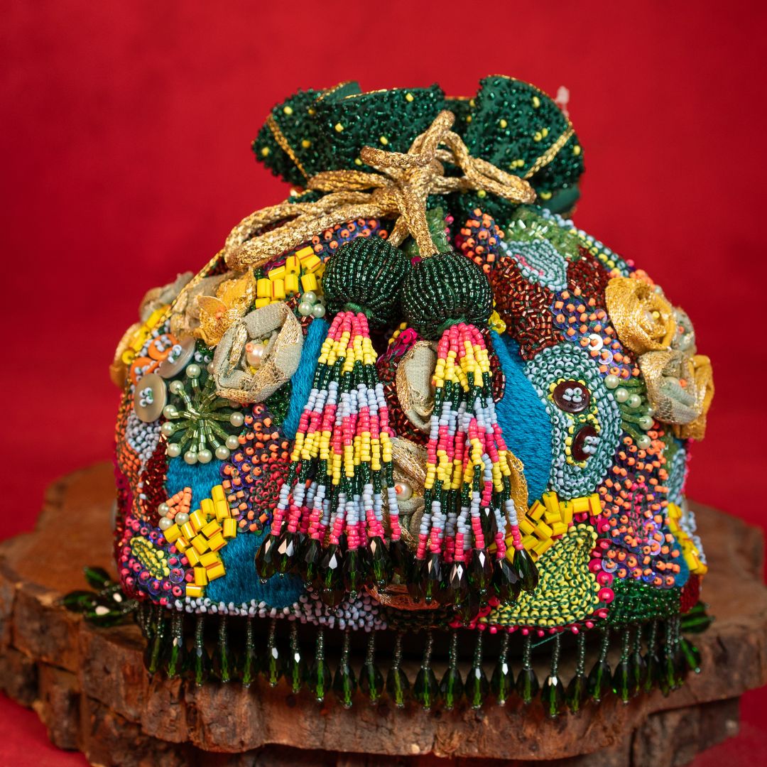 The Mehak Potli is a hand-embroidered green pouch featuring exquisite multicoloured threadwork that exemplifies skilled craftsmanship. Its vibrant embroidery enriches the classic green base, creating a striking yet elegant accessory ideal for festive occasions. Compact and stylish, this potli offers both charm and functionality for carrying your essentials with refined ease.
