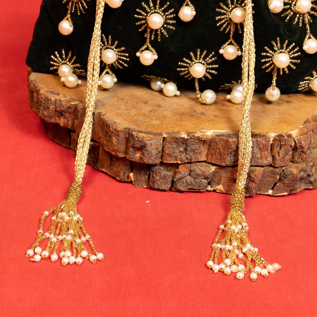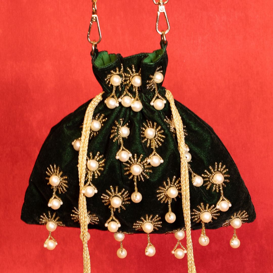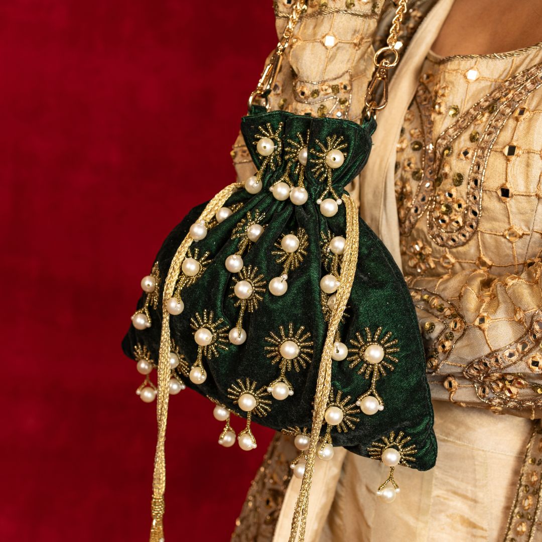 The Padmini Green potli is a compact and elegant accessory crafted from soft velvet. Its rich texture and complementing design details make it perfect for carrying essentials with style. Ideal for adding a touch of sophistication to your look while ensuring convenient portability.