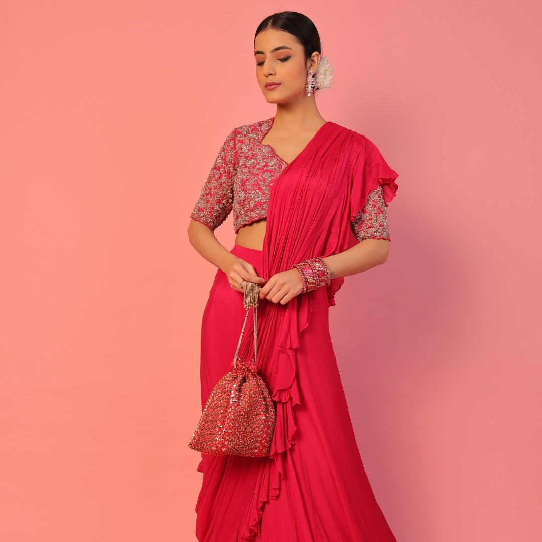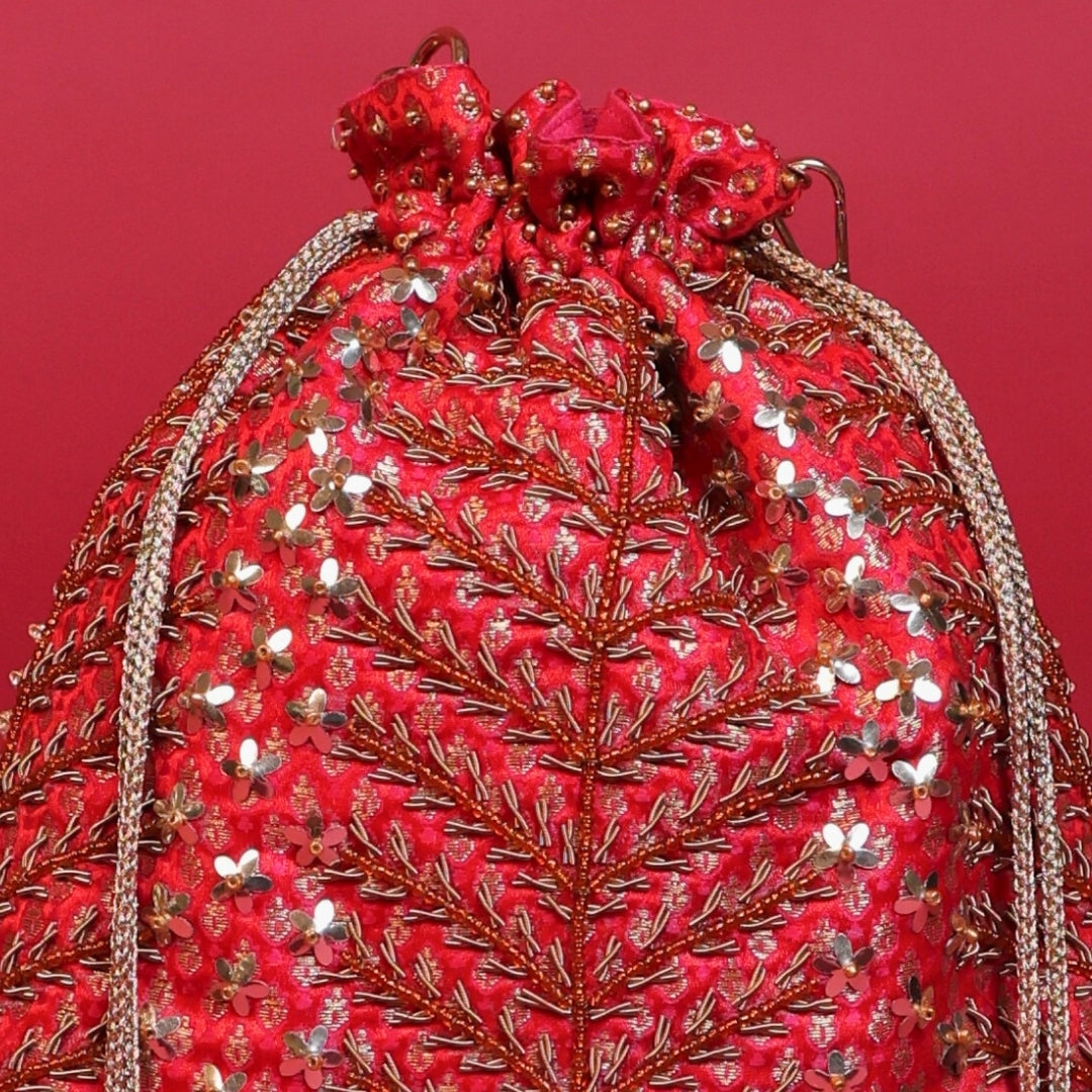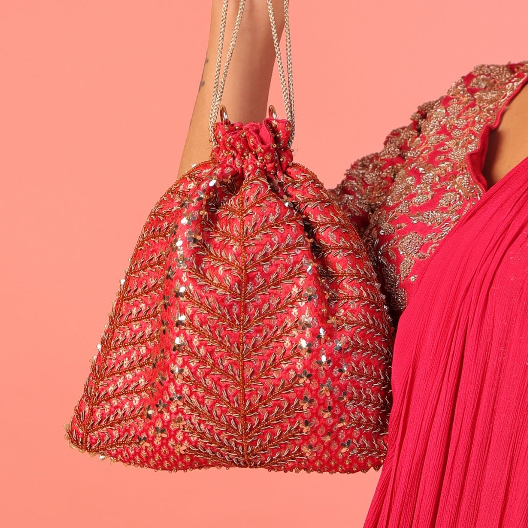 Rooted in tradition and elevated by fine craftsmanship, the Pushkara Potli draws inspiration from sacred floral forms and festive Indian artistry. Handcrafted on a rich jewel-toned base, it features intricate fern-inspired hand embroidery accented with delicate floral sequins and metallic threadwork. The structured silhouette is softened with elegant drawstring ties, finished with handcrafted bead tassels that add graceful movement. Timeless yet statement-making, this potli is designed for weddings, festive celebrations, and ceremonial occasions. Meticulously crafted by skilled Indian artisans, it reflects GLAMGLINT’s legacy of heritage luxury and enduring elegance.