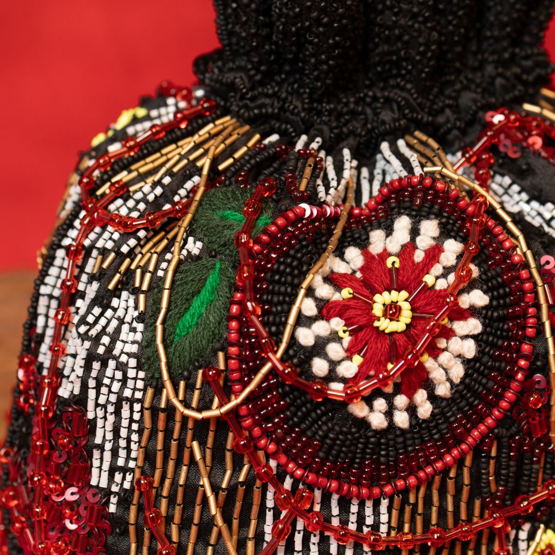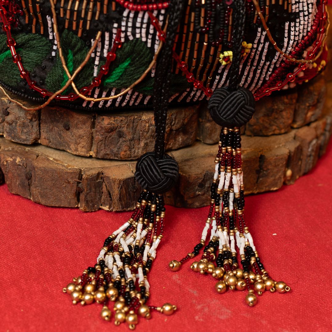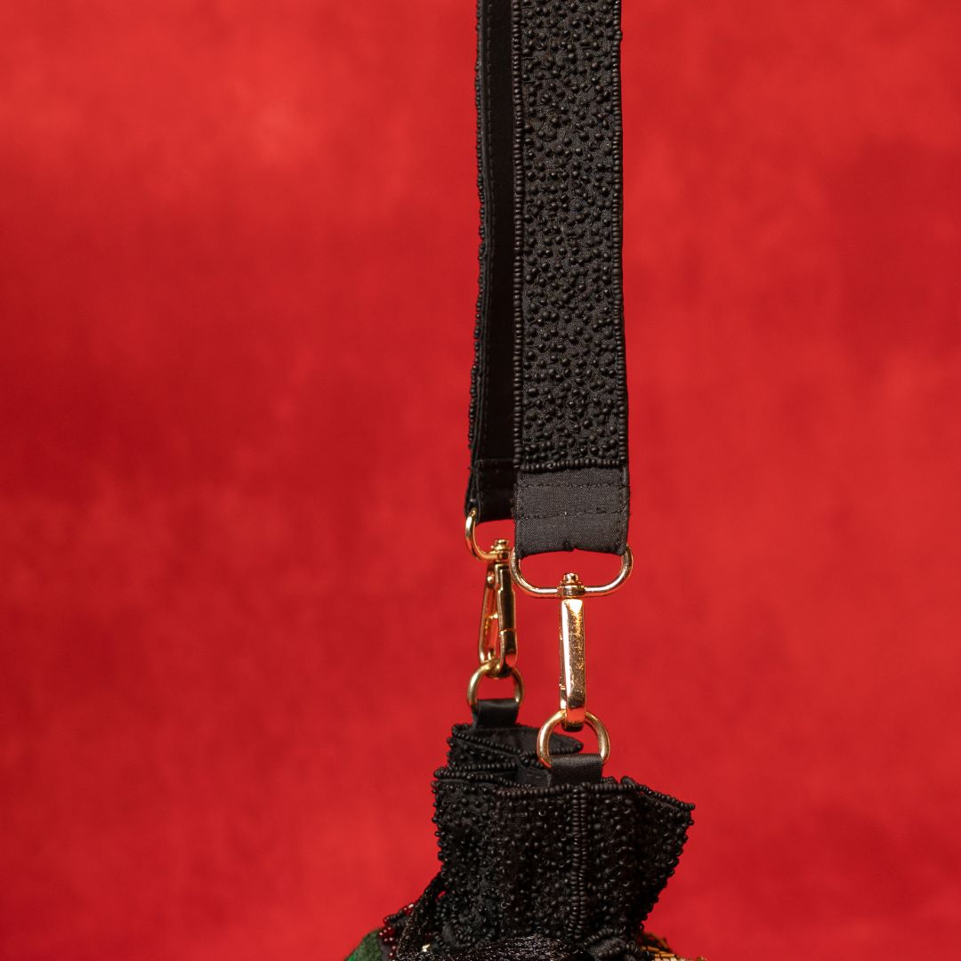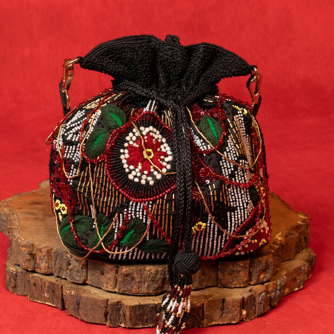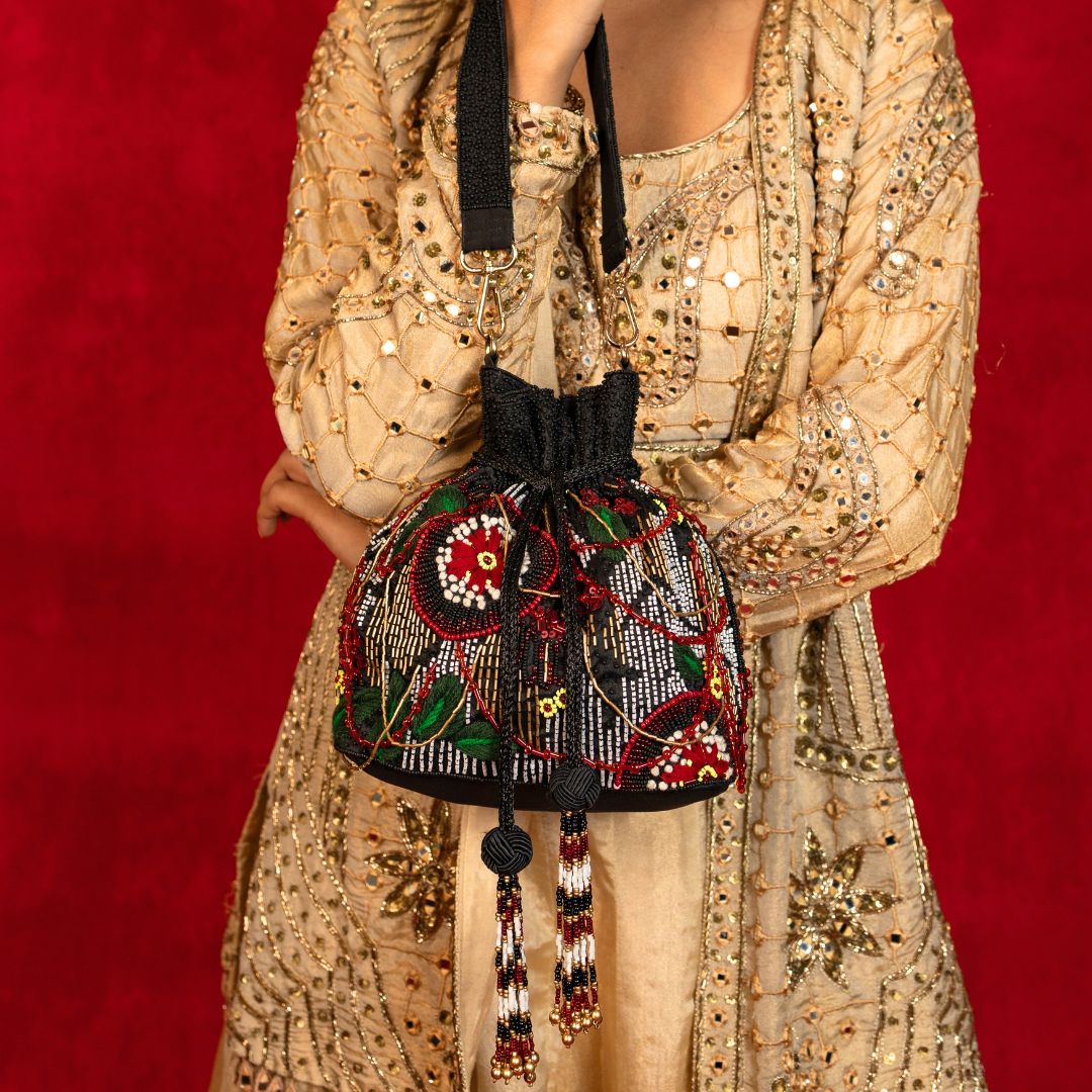 The Rosalie Potli features a rich black base fabric, intricately embroidered to enhance its elegant appeal. This expertly crafted accessory blends traditional craftsmanship with contemporary style, making it an ideal choice for elevating your outfit at festive occasions or special events. Its compact design ensures practicality without compromising on sophistication.