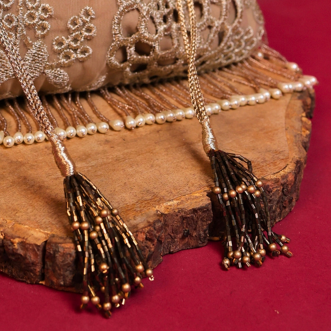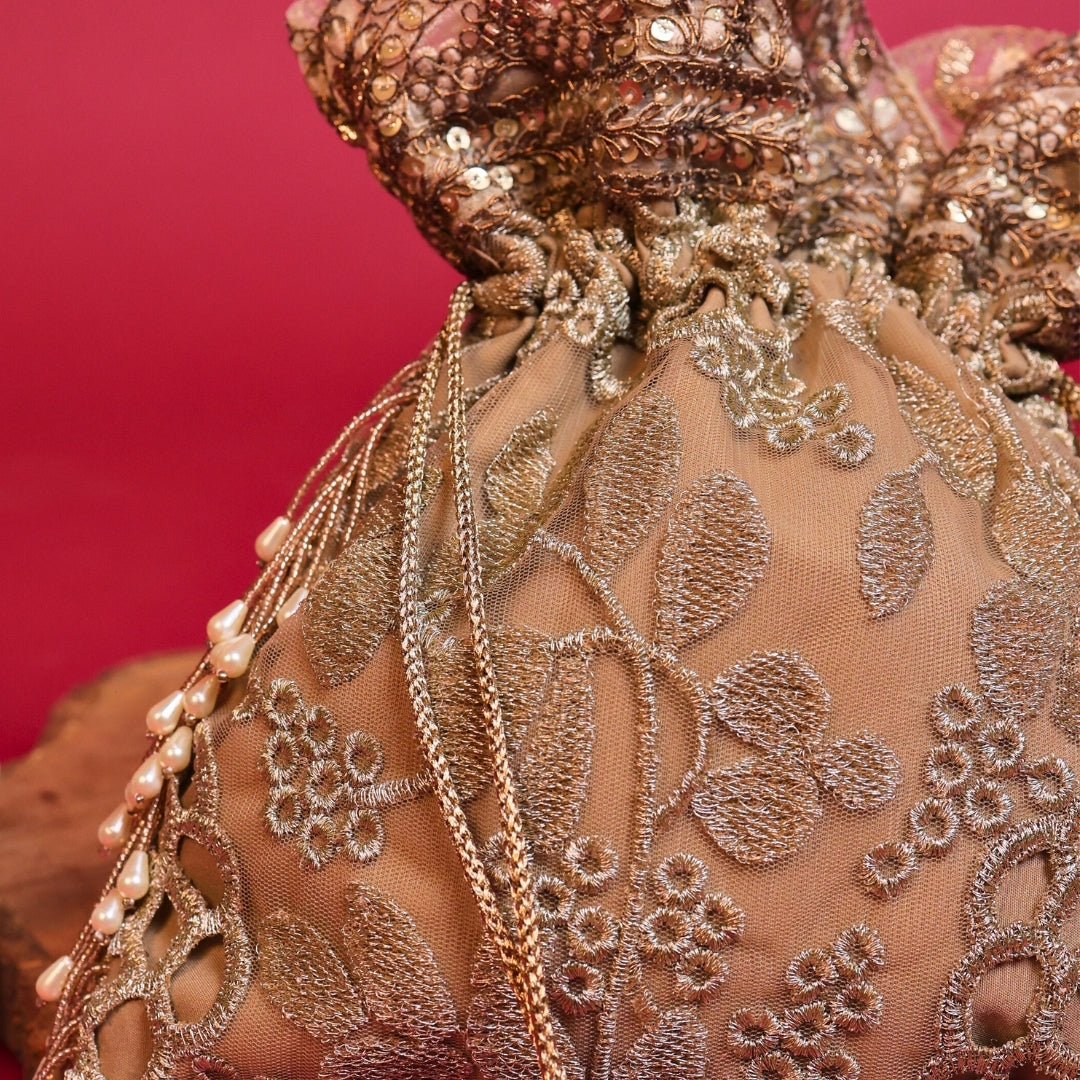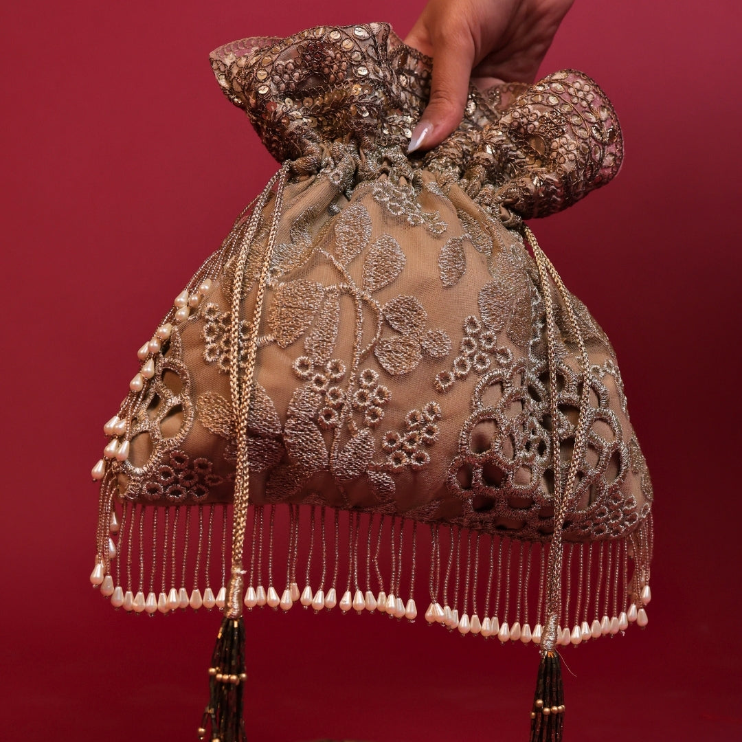 Delicate and timeless, the Serene Bloom Glint Potli is a graceful expression of GLAMGLINT’s artisanal heritage. Crafted in a soft neutral mesh base, this potli is adorned with intricate floral embroidery, subtle metallic threadwork, and finely detailed cutwork motifs. The scalloped embroidered border adds refined structure, while pearl-edged fringe detailing lends gentle movement and feminine charm. Finished with handcrafted drawstrings and beaded tassels, this piece is designed to complement weddings, daytime festivities, and elegant soirées. Handcrafted in India by skilled artisans, it embodies quiet luxury and enduring craftsmanship.