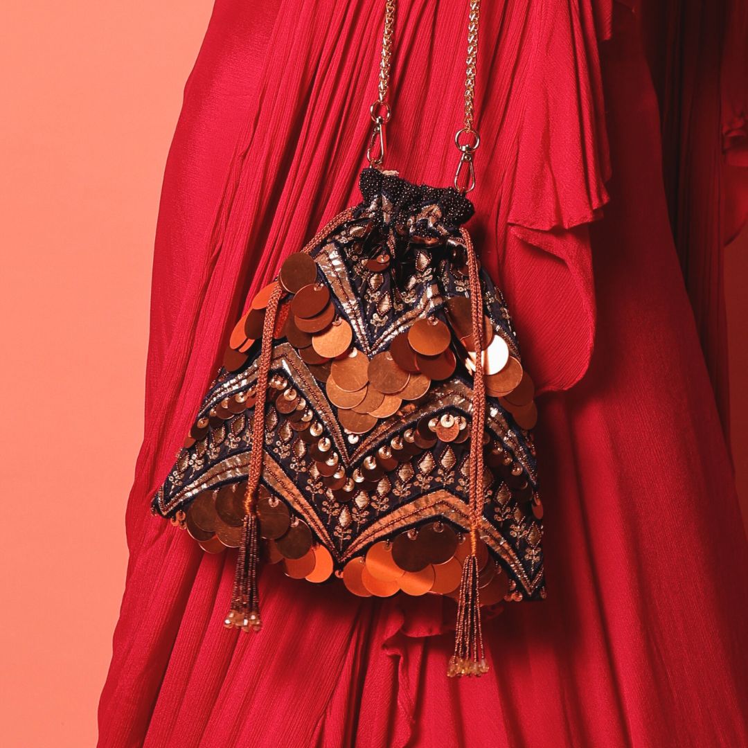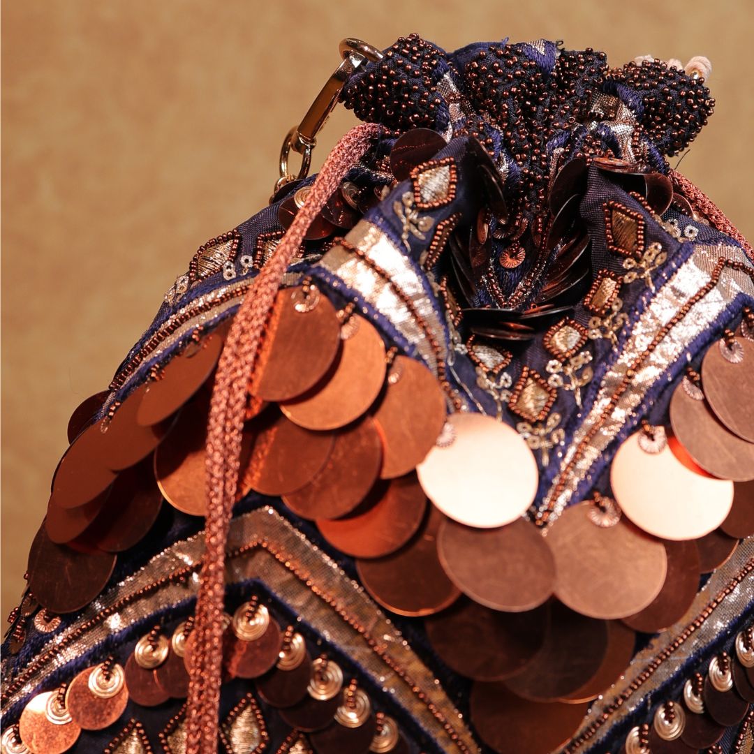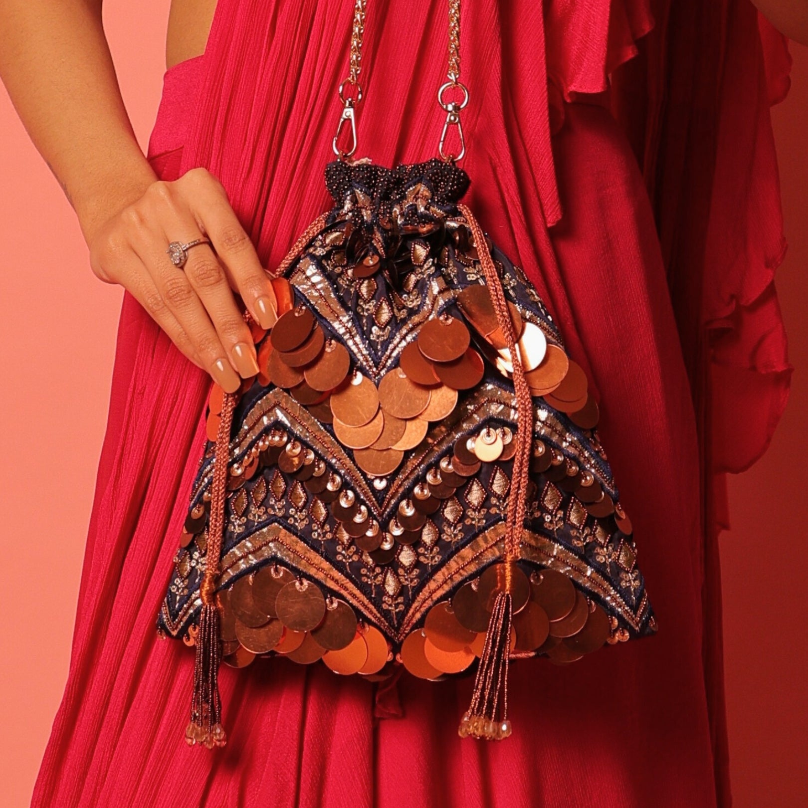 The Taraaya Copper Chevron Potli is a radiant blend of Indian craftsmanship and modern elegance. Handcrafted on a deep navy base, it features intricate zari chevron embroidery highlighted with layered copper disc sequins that shimmer with every movement. Finished with beaded drawstrings and tassels, this potli is designed to elevate festive, wedding, and evening looks. Ethically handmade in India by skilled artisans, it is a statement accessory made to shine.