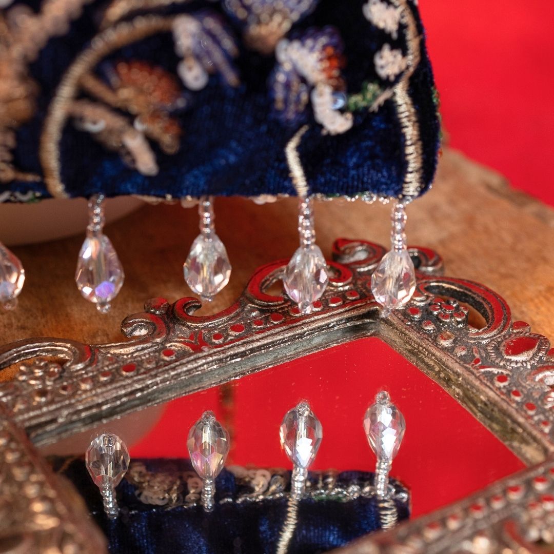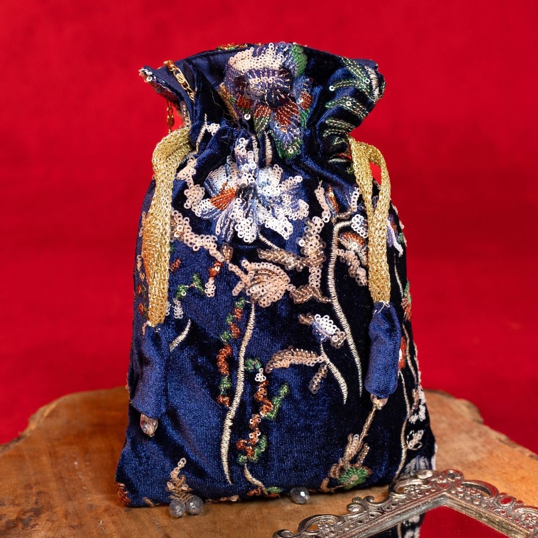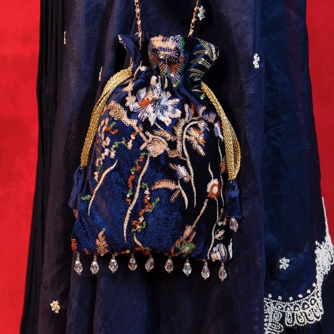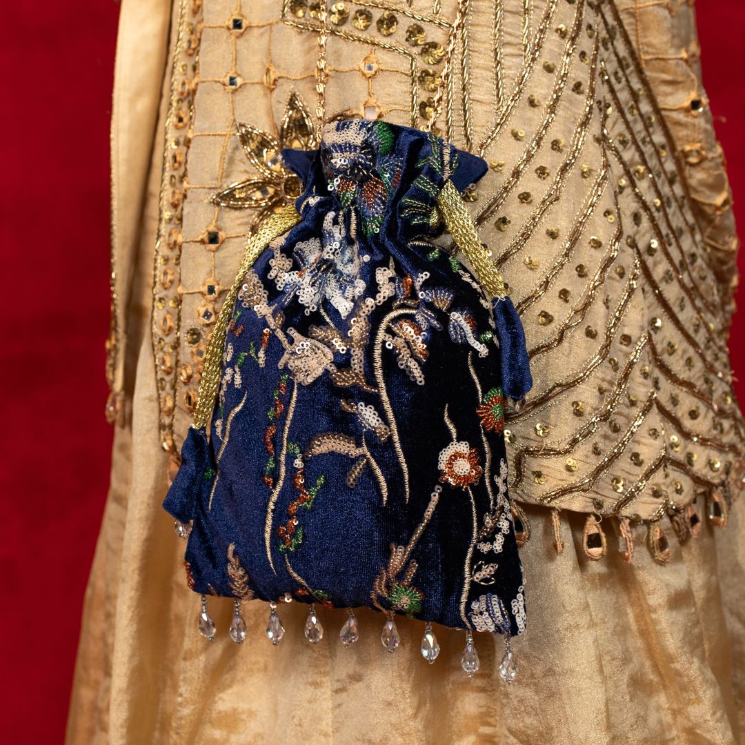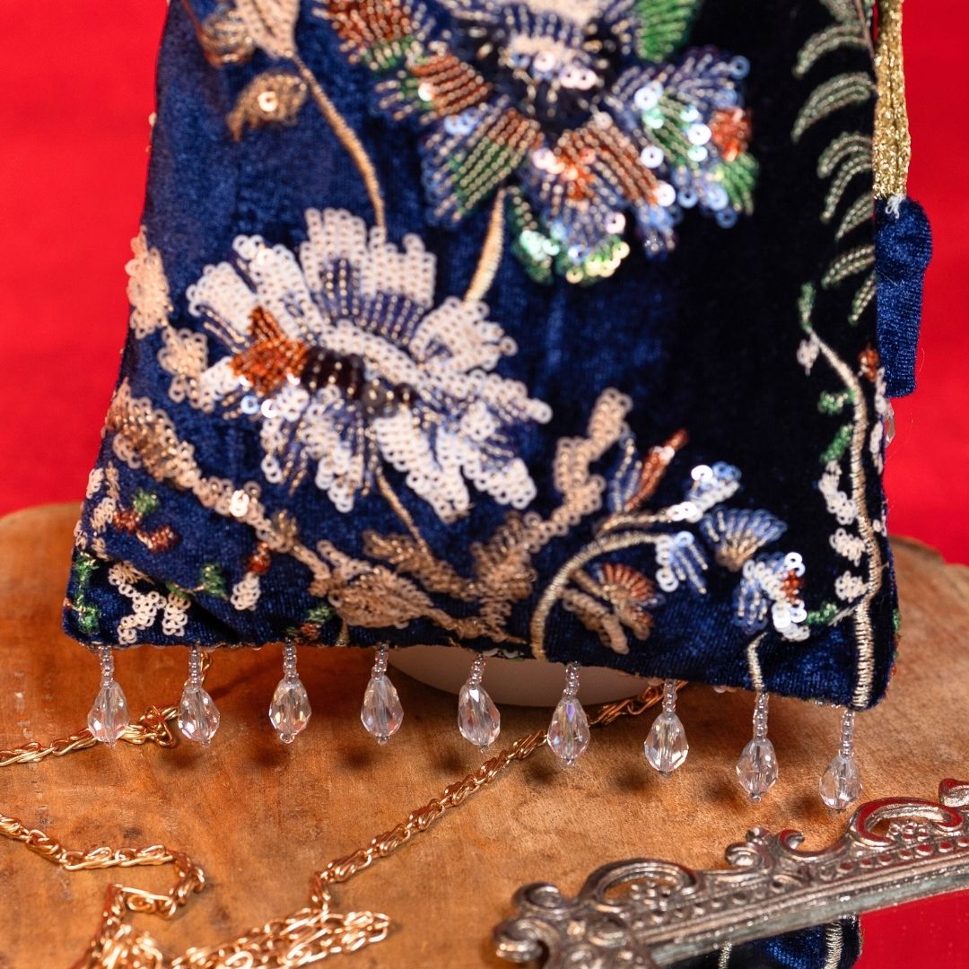The Velvet Mirage Blue potli is a compact and elegant accessory crafted from soft velvet. Its rich texture and complementing design details make it perfect for carrying essentials with style. Ideal for adding a touch of sophistication to your look while ensuring convenient portability.
