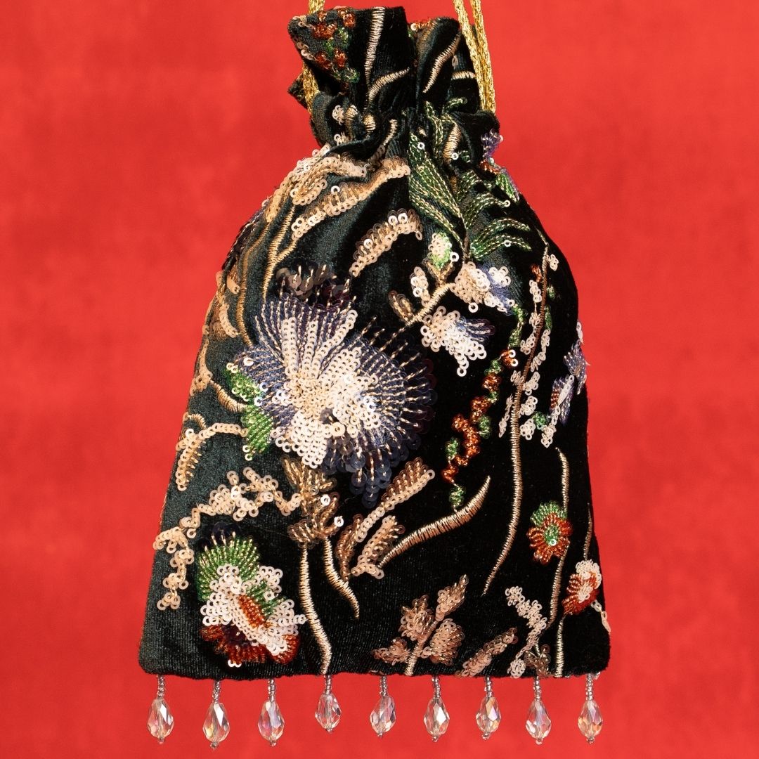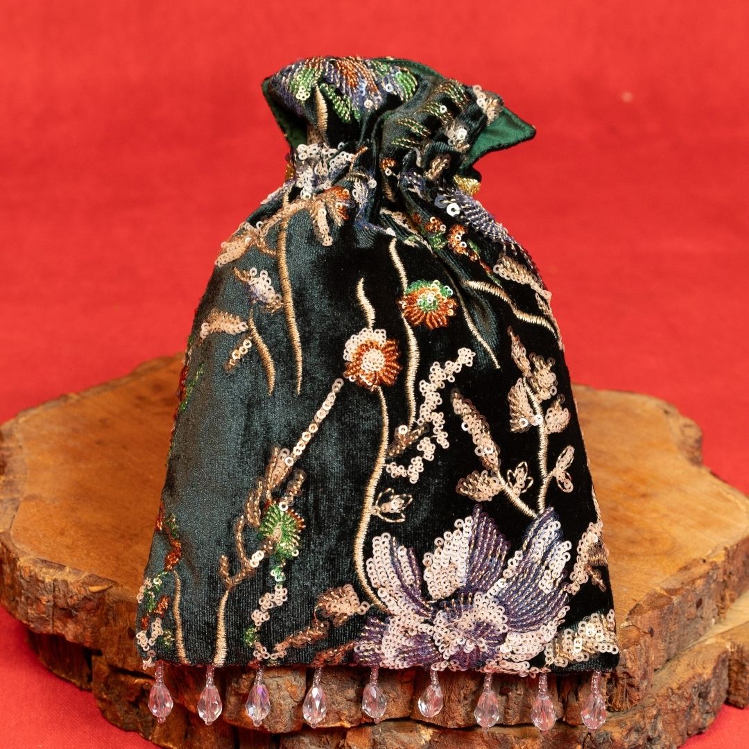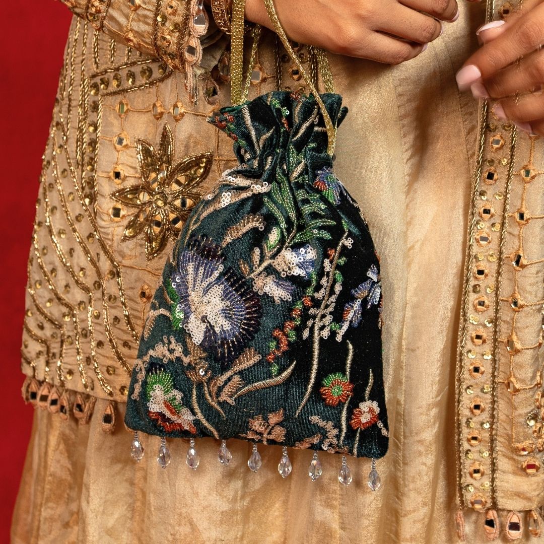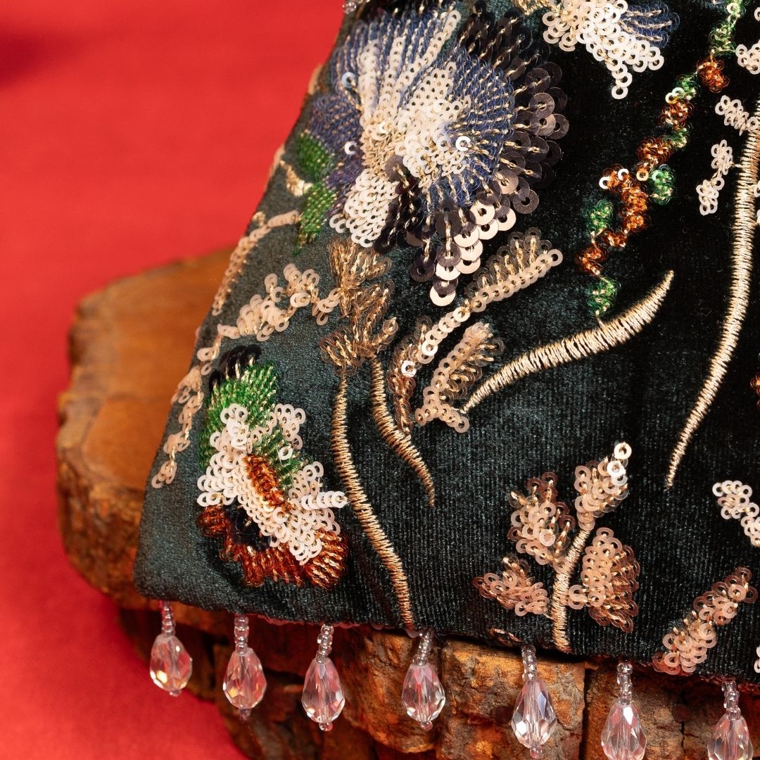The Velvet Mirage Green potli is a compact and elegant accessory crafted from soft velvet. Its rich texture and complementing design details make it perfect for carrying essentials with style. Ideal for adding a touch of sophistication to your look while ensuring convenient portability.